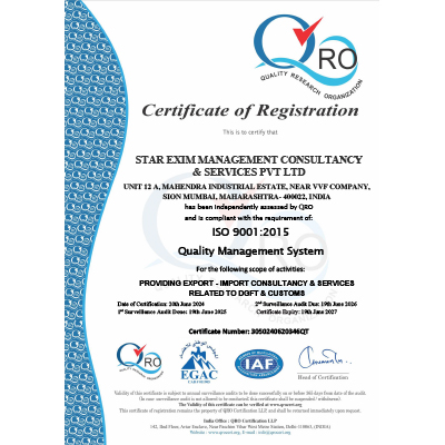 Star Exim Management Consultancy & Services Pvt. Ltd. is certified to ISO 9001:2015 – Quality Management System.