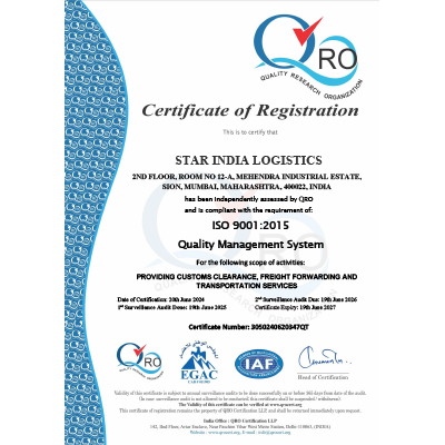 Star India Logistics holds ISO 9001:2015 – Quality Management System certification.